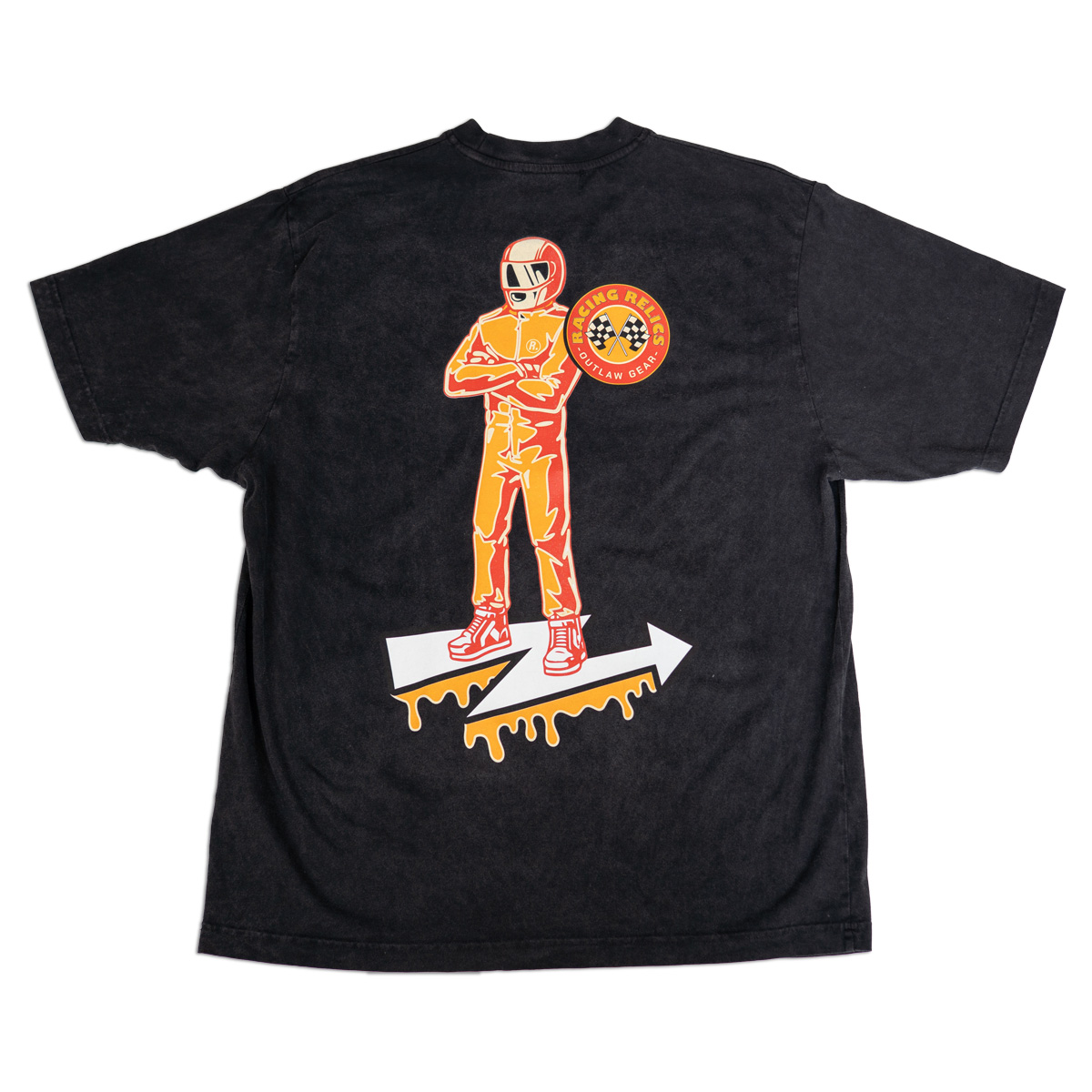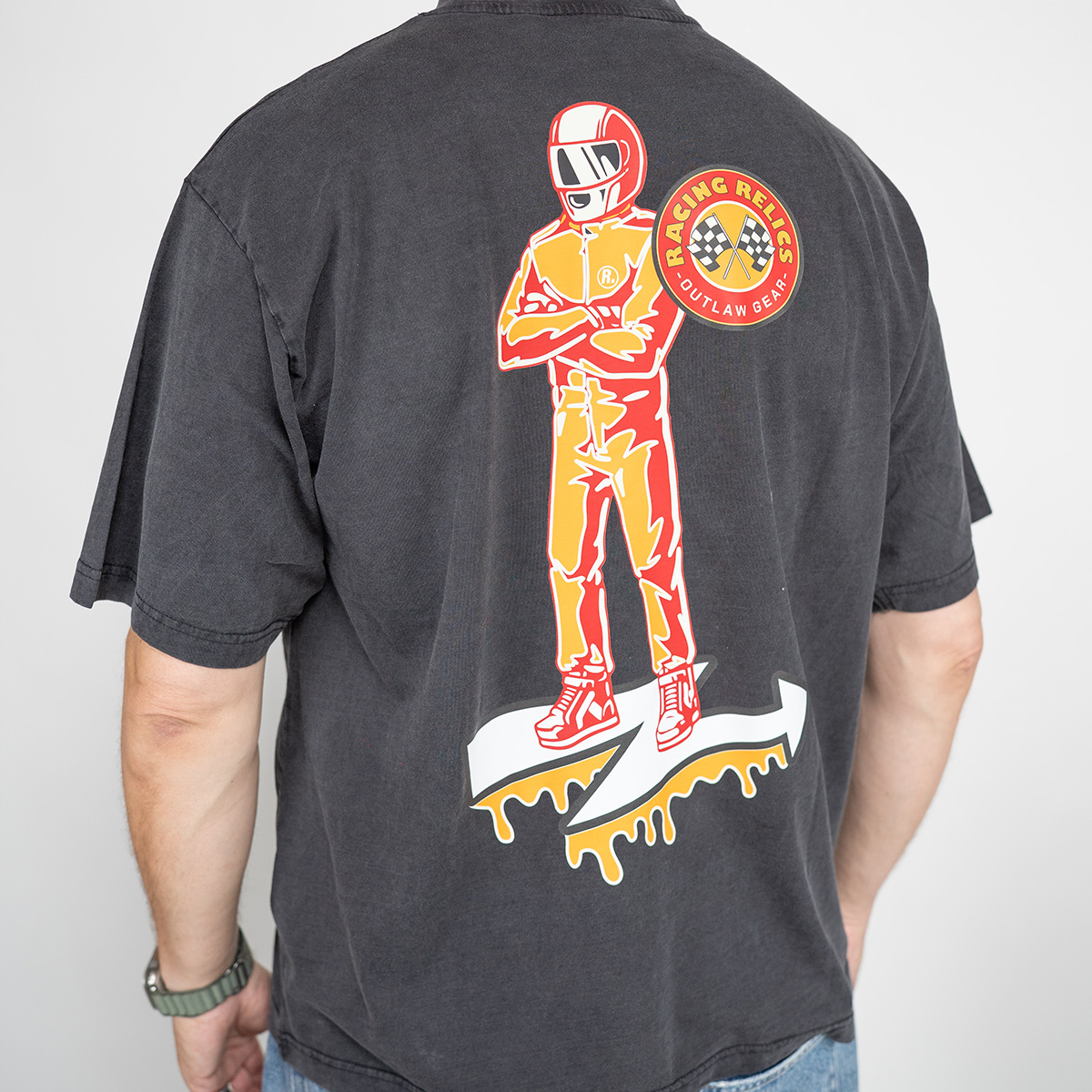 Featuring a bold, full-back print of the Racing Relics driver standing over the signature lightning arrow, this piece captures the essence of 1970s pit-lane bravado, paired with the refined craftsmanship of modern streetwear.