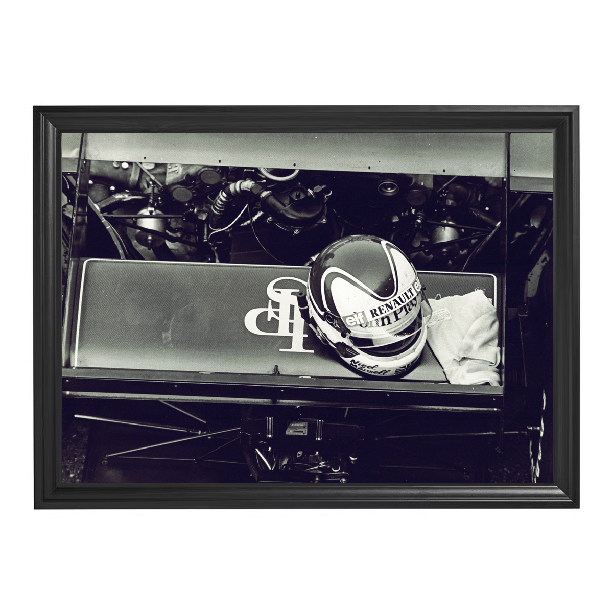 Racing Relics motorsport art, Formula 1 wall art, Renault GP helmet photography, black-and-white racing print, vintage motorsport artwork, framed racing memorabilia, 70 × 50 cm art print.